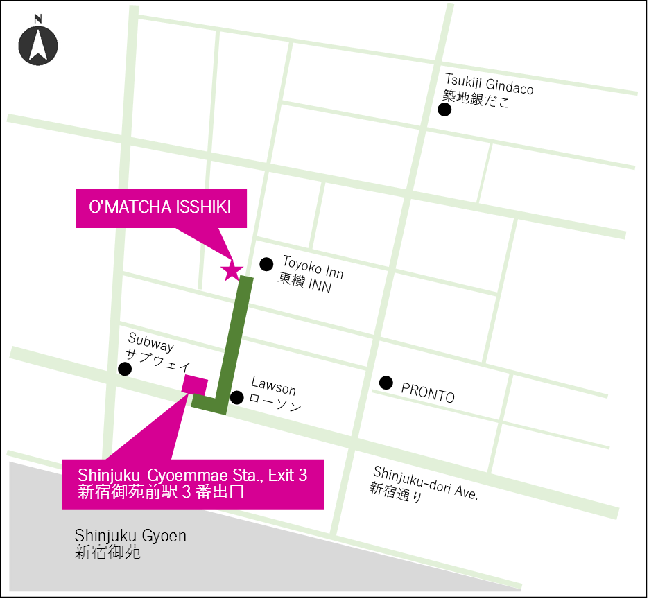 It is a 2-minute walk from Exit 3 of Shinjuku-Gyoemmae Station on the Marunouchi Line. Take the elevator located at the main entrance of the building to the 4th floor. After exiting the elevator, turn right and proceed to the room at the end of the hallway. Please ring the intercom near the door of the room about 5 minutes before your scheduled time and enter.